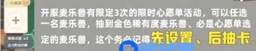 开服麦乐兽有限定3次的限时心愿单活动,可以任选一名麦乐兽,抽到金色稀有度麦乐兽、必是心愿单选定的麦乐兽,这个务必记得先设置、后抽卡
