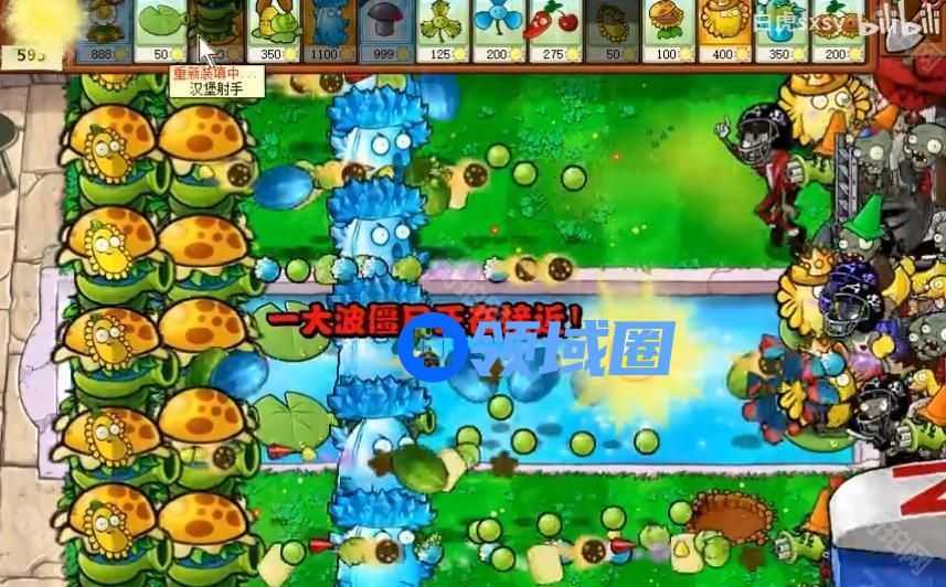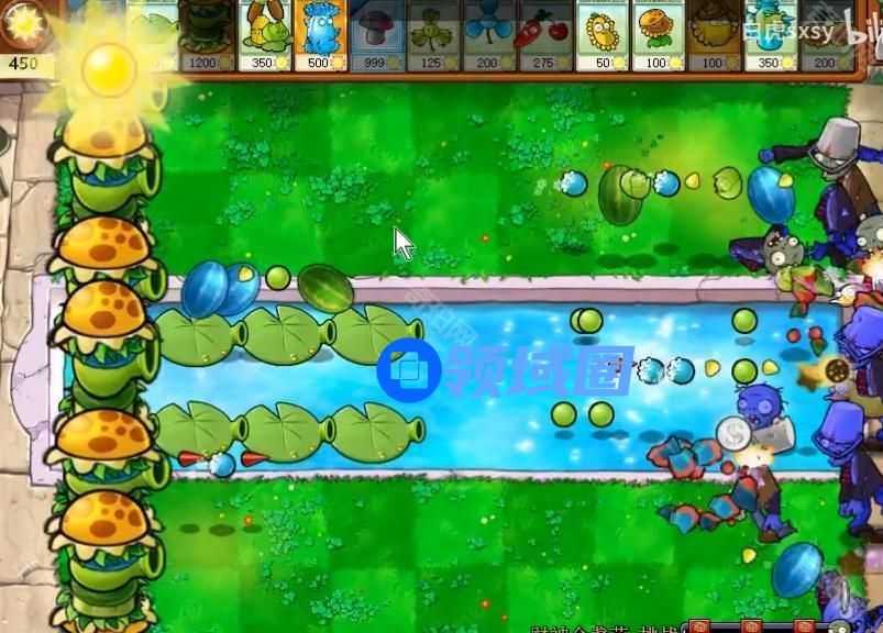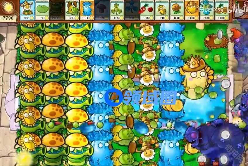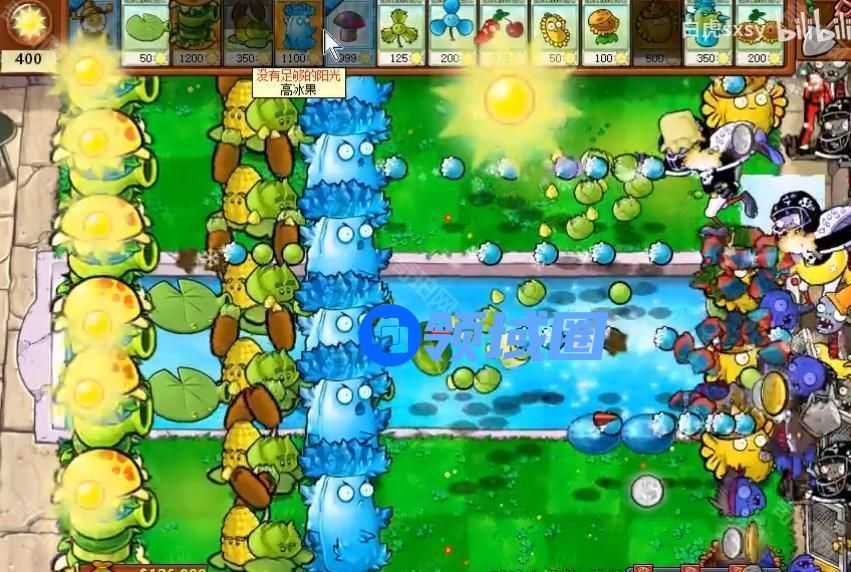 4、高冰果后面放一排玉米卷香蒲,后面继续放汉堡射手,加强攻击。
