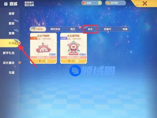2、如下图所示,在主页面点击左侧礼包,在礼包页面选择金豆。