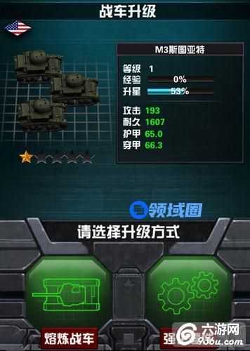 升级是车辆提升属性的最基础的方式。游戏中提供了两种获得战车升级经验的方式:熔炼战车和使用强化零件。