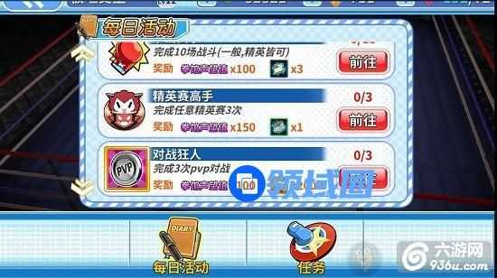 每天简单的活动任务对于任何玩家来说都算的上是肥差一件。扭五个蛋,强化3次核心技能,随便打三场PVP比赛,都能获得大量的拳馆经验。每解锁一个新功能,日常任务就会多一项喔。后期每天可通过活动获得的拳馆经验更是高达870点,这么丰厚的经验,哥哥们每天可不要忘记领取喔。