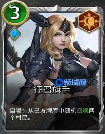 执警我认为是不可忽视的卡牌,3契约值算是中上水平,锁定效果也是对遗言类牌的最好克制,有时锁定对方一个关键牌,就可打乱对方筹谋已久的规划;而且锁定的同时还能造成1点伤害,对于杀狼和破护盾方面真的是最佳选择。征召旗手的效果是从我方牌库中召唤两个村民,可以瞬间打开卡差,既保证了狼人和其它隐藏牌的安全,又为我方提供了场面上可行动的契灵。