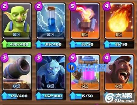 可替换卡牌:亡灵换亡灵军团、地狱塔换小骷髅等。白卡等级8级即可,但电击法术最好9级(因为8级小闪电不死9级近战哥布林,这点很关键)橙卡野猪骑士建议6级,其他5级即可。