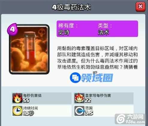 4级毒药,范围伤害55*10秒=550,皇家塔伤害22*10秒=220。