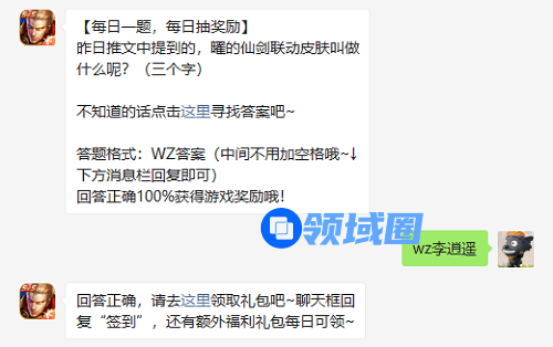 【每日一题,每日抽奖励】昨日推文中提到的,曜的仙剑联动皮肤叫做什么呢?(三个字)不知道的话点击这里寻找答案吧~答题格式:WZ答案(中间不用加空格哦~↓下方消息栏回复即可)回答正确100%获得游戏奖励哦!