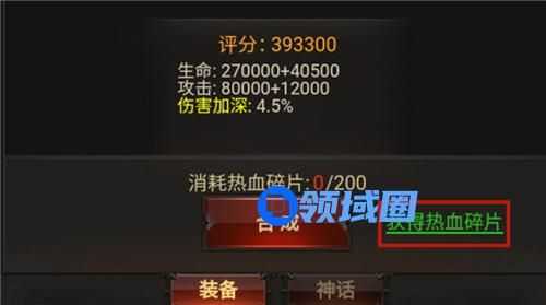 比如你抽到了热血神甲,但你想要的是热血神剑提高伤害,就可以来到神装页面,点击右下角的“获得热血碎片”。
