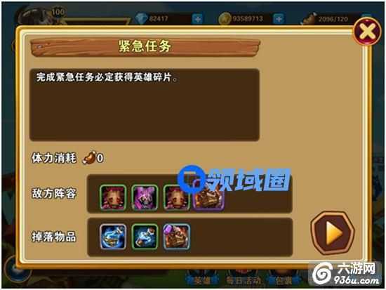 另外,在玩家通关副本时,有一定概率可以激活一个紧急任务。紧急任务每周都会提供一个固定英雄的碎片掉落。当玩家激活紧急任务后,只要在主界面中点击"紧急任务"按钮,便可以进入一个额外的任务副本。只要击败副本中的怪物,便可获得该英雄的碎片。