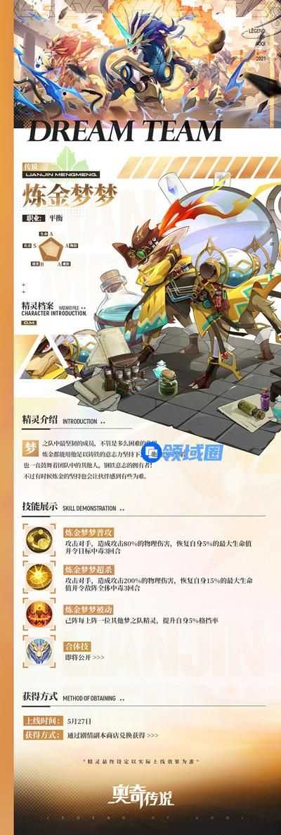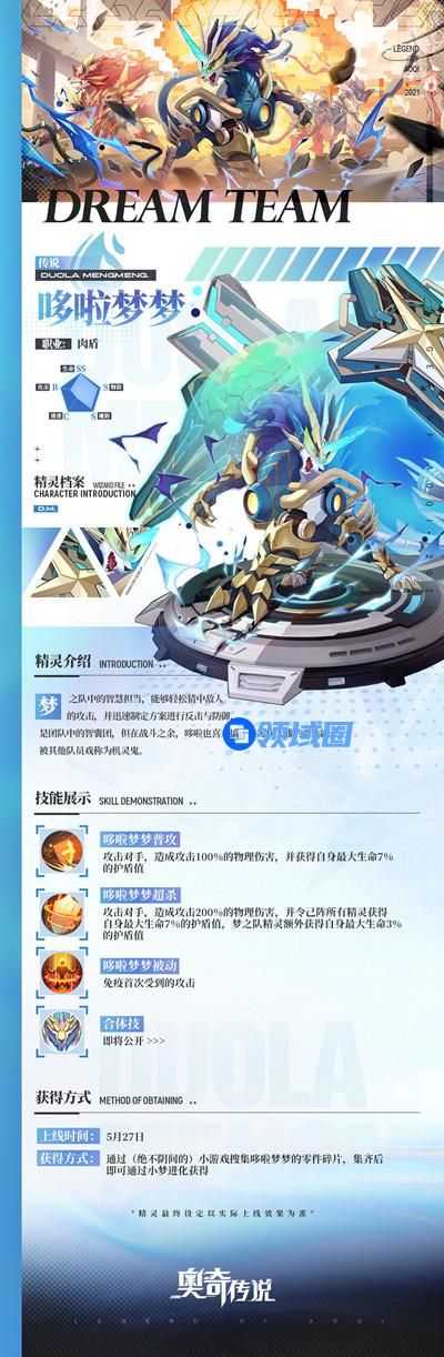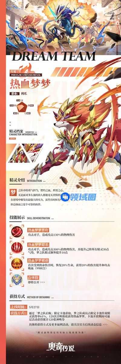 获得方式:通过「梦之队启航」限定卡池获取,梦之队成员占限定卡池传说精灵获得率61%,120次召唤保底获得热血梦梦,卡池开放期间可通过活动获得累计120张神唤券