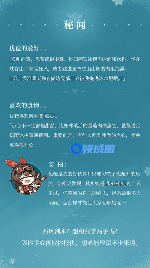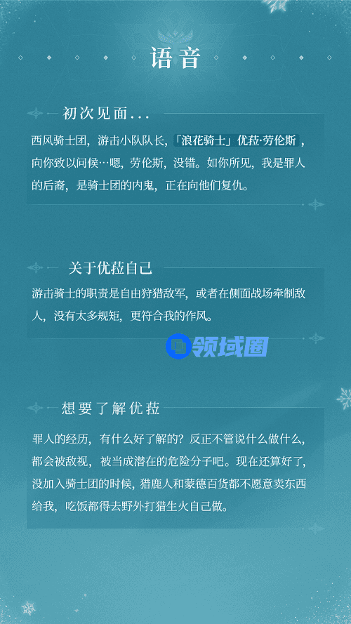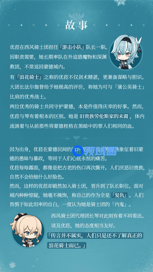 优菈接受试炼时年纪尚小,却轻松通过试炼,获授「坚冰之印」。带着这份荣耀,她离开了家族,此后联系甚少。她的冰之剑,正是如此实力的体现——像寒风暴雪般凛冽,足以逼退任何人。剔透又璀璨的她本应如同寒冰,却有着「浪花骑士」之名。人们听见这一名字,总会以为她能够驱动水元素力。