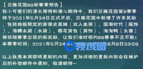 在小可爱们的漫长等待和满心期待中,我们贝雅花园第9赛季将于2021年5月24日正式开启,贝雅花园中新增了许多奖励,包括绝版限定的音律史莱姆(双人坐骑)、国潮时代(服饰)、海螺水袋(水袋)、樱花背包(背饰)、淘淘鸭(头像)等伴随赛季出现的新奖励,让我们准时相约S9赛季不见不散!