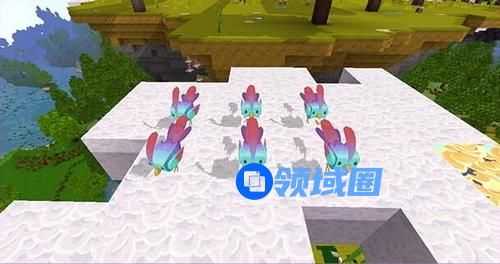 飞鸡以及新增生物雀莺、蝴蝶在空岛上宁静的生活。据说在大片空岛上有几率刷新空岛神殿,富裕的空岛商人带着宝箱在空岛等你探险哦~