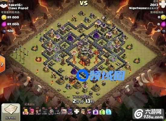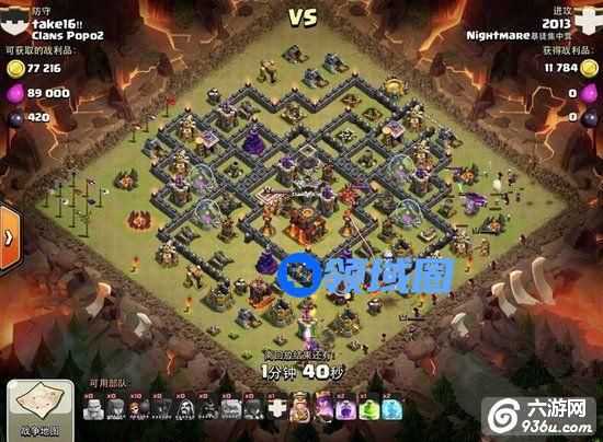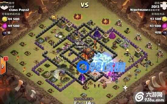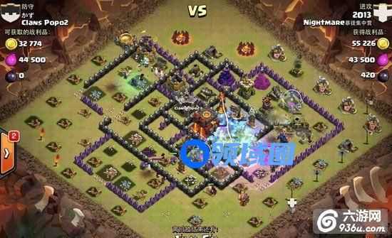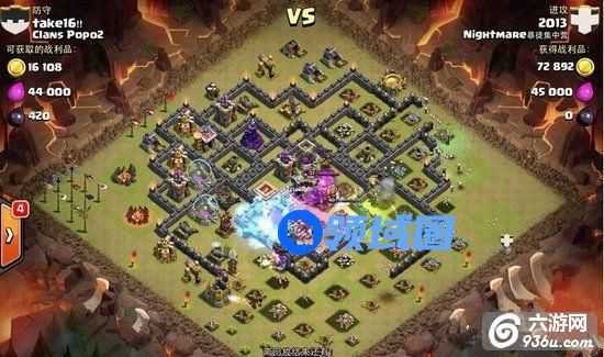 1、他先从左侧上方用3个气球和4个野猪把对方的联盟兵全部引出来拖到角落防御护不到的地方灭掉,顺便推掉几个防御。