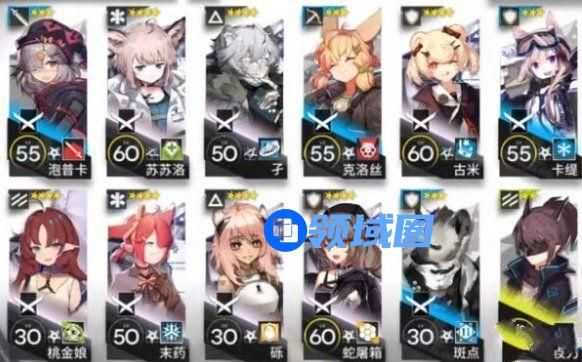 向日葵先锋(桃金娘);群攻近卫(泡普卡);单体治疗x2(苏苏洛、末药);自闭近卫/特种(孑);快速复活(砾);单体狙击(克洛丝);重装x4(古米、卡缇、斑点、蛇屠箱);替补(夜刀)