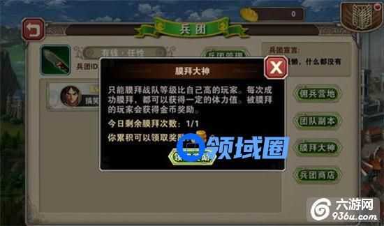 这是加入兵团以后特有的福利,每天膜拜可以获得体力值的奖励。不过只能膜拜比自己等级高的玩家哦。
