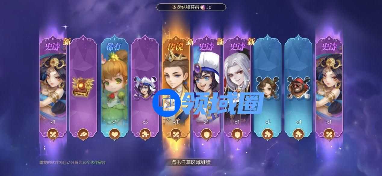 在结缘中,会抽到不同数量的伙伴碎片、完整的伙伴、伙伴升级用的魔力糖果以及提高伙伴好友度的伙伴礼物。