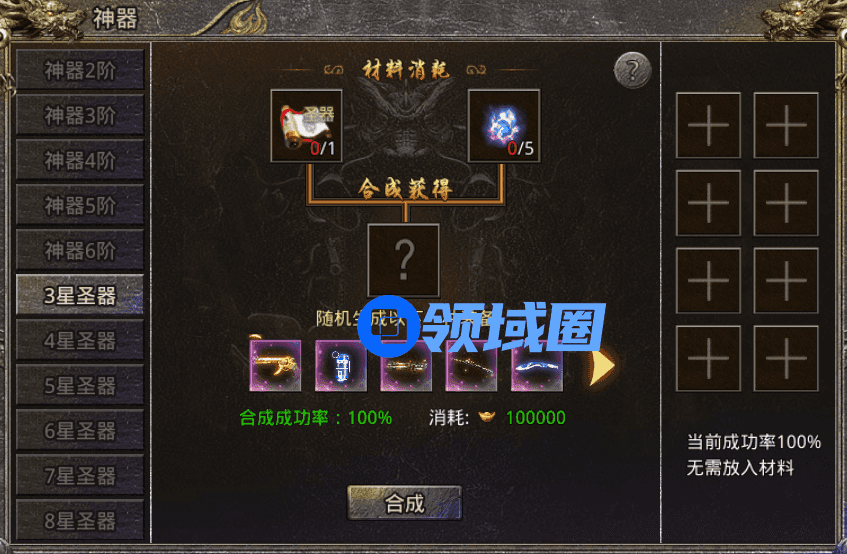 圣器合成找到神界使者(盟重省-传送员-庄园-神界使者),三星圣器通过消耗圣器图纸和雷渊圣石合成获得(随机生成)。