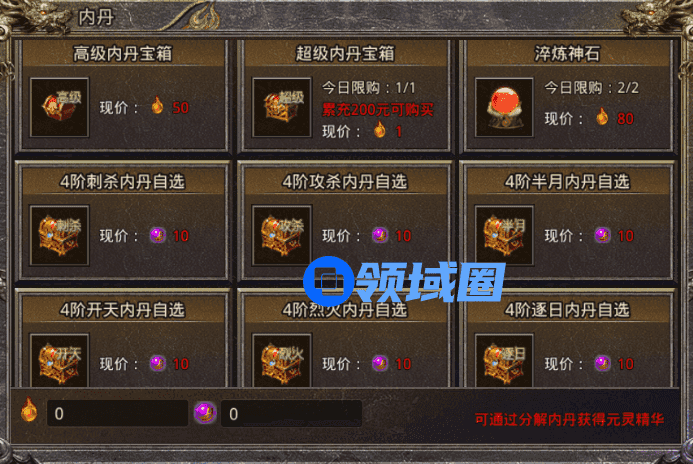 1.在苍月岛玄天尊主处可用元灵精华和内丹精华兑换内丹自选箱,元灵精华和内丹精华通过参加无名山庄绝世剑冢玩法可获得