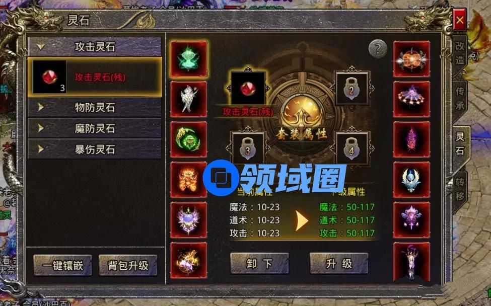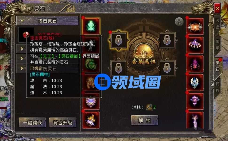 给神器开好孔后,我们可以选择指定属性的灵石镶嵌在神器已开孔的位置,这样神器就可以获得额外的属性加成,同时小伙伴还可以对已镶嵌的灵石进行升级,等级越高,属性加成越多,当神器被击落或者没有穿戴的时候,灵石属性依然是生效的。