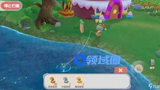 买到鱼饵之后,我们前往钓鱼地点,就可以进行钓鱼了。目前游戏中比较常见的钓鱼地点有家园、雪山、浆果森林以及开心农场等,主要都是一些有湖有小溪的地方,就可以进行钓鱼了。