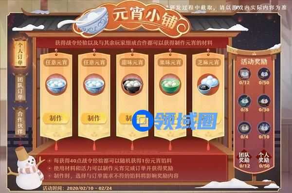 2.元宵佳节,快叫上伙伴一起开「元宵小铺」做元宵啦。「元宵小铺」每日将刷新订单,道友可通过获得战令经验、与其他道友合作获得元宵食材,消耗材料和活力加工元宵,即可完成你的订单!