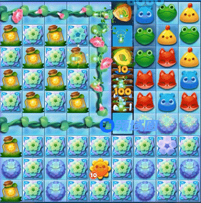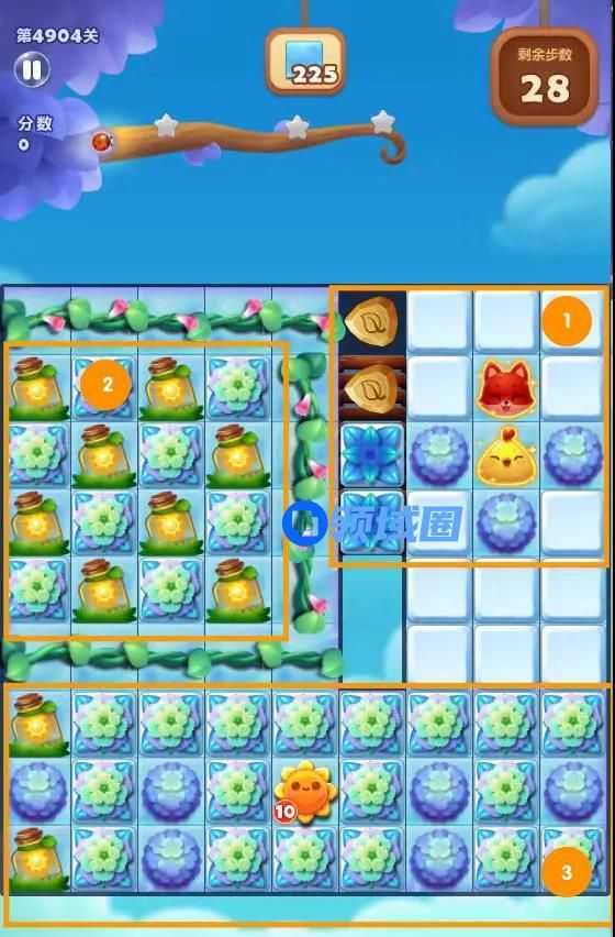3、第三步:清除雪块并击打花团,花团可助力消除阳光瓶和雪块,待阳光瓶消除后激活太阳花,实现清屏一次。