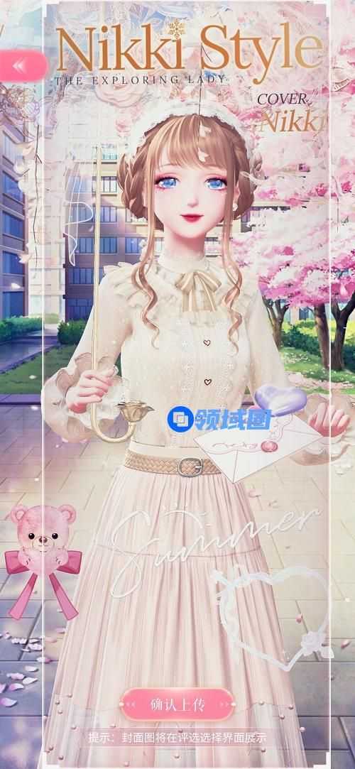 4、而最关键的还是场景和氛围塑造,这次的新贴纸的樱花+校园大楼的背景是必不可少的,必须要整上去,表情动作自然一点,选择侧身牛头的动作是最完美的,整体的贴纸突出一种粉色系为主可爱的风格,最后记得如果你之前拿到了情人节套装的大熊熊,一定要佩戴上,这个也是完美的加分项。