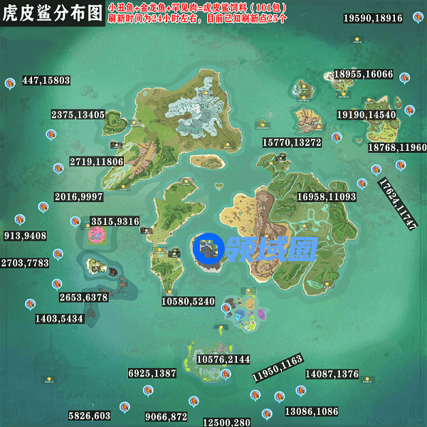 2、虎皮鲨饲料(101包)=小丑鱼+金龙鱼+罕见肉,刷新时间为24小时左右,目前已经知道的刷新点为25个。