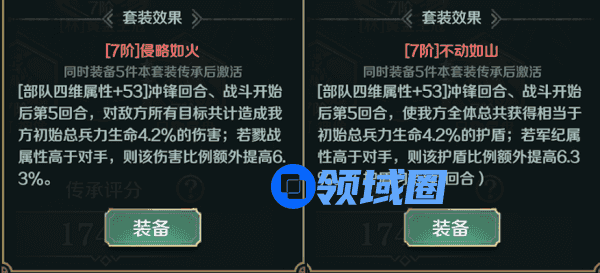 3.侵略如火和不动如山传承套装可在冲锋回合及战斗第五回合给敌军造成伤害或给己方提供护盾,适合持续输出的队伍或抵挡持续输出的队伍携带。