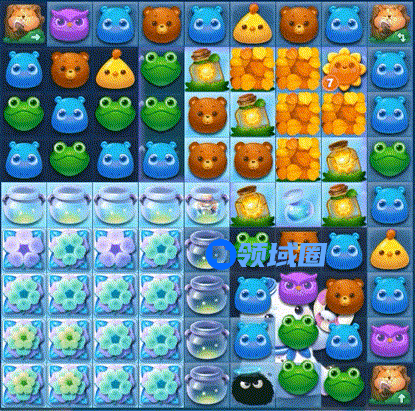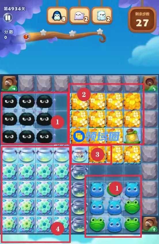 1、关卡难点:本关的难点主要集中在消除的中后阶段,即太阳花释放之后。这个阶段,小村民普遍剩余的步数大概位于12-15步区间内,而剩余需消除的冰块较多,冰层较厚。若没有很好的特效合成机会,局面不易打开。