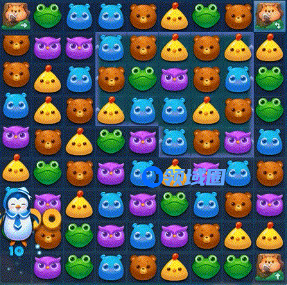 2、步骤拆解:第一步,三消击打小松鼠,毛球上下跳跃借助两个角落里的小松鼠激活紫咪雕像。