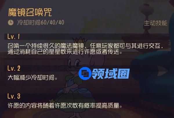 Lv1:召唤一个魔镜,三颗星星可以许愿道具,六颗星星可以全图传送。