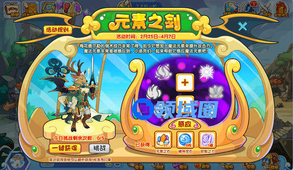 1、每天5次机会挑战梅花德尔勒,成功可随机获得精神灵石和控制之力。元素之石到天空城——风铃岛用星星魔法砸法阵获得(获得的元素之石仅在活动界面显示)需要点亮的魔法元素有水系、火系、恶魔系、光系、土系、雷系,感应有概率失败,小洛克们可以试试携带与元素属性类似的主属性宠物提升成功率。