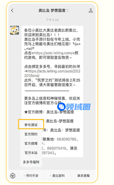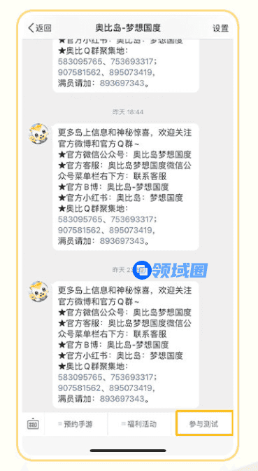 2、微信获取方式:进入奥比岛梦想国度微信公众号菜单栏,点击预约手游-参与测试,即可领取测试包体链接。