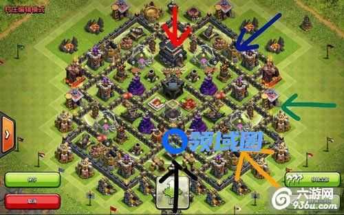红色方向:需要突破两层墙及三层防御才能攻击到黑水,但是炸弹人和大部队都容易走偏。适合地震开墙。
