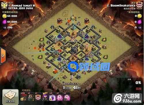 对面的双王才是初九的等级,但X弩、法师塔、迫击炮、加农炮和电塔都已达到满九。所以这次就选择直接丢狗球进去,如果女王等级较高,而当自己女王也较高是,可以选择天女,但要注意时间。
