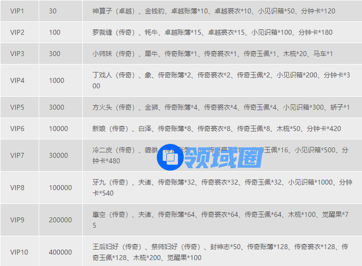 VIP10元:400000,王后妇好(传奇)、祭师妇好(传奇)、封神志*50、传奇账簿*128、传奇裘衣*128、传奇玉佩*128、木梳*200、觉醒果*100