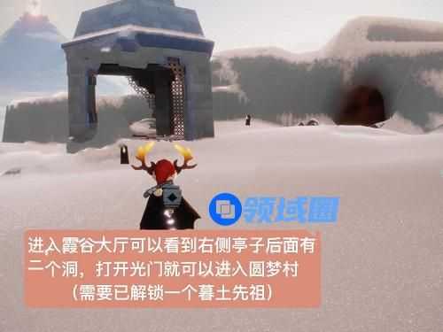 1、进入霞谷大厅可以看到右侧亭子后面一个洞,打开光门就可以进入圆梦村了。(需要解锁一个暮土先祖才能进入。)