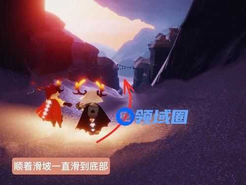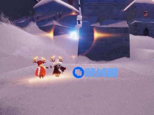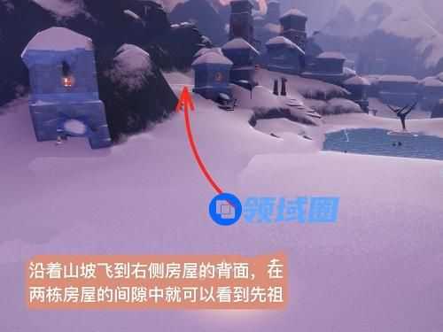 3、进入底部后沿着山坡飞到右侧房屋的背面,在两栋房屋的中间缝隙间就可以看到先祖了。