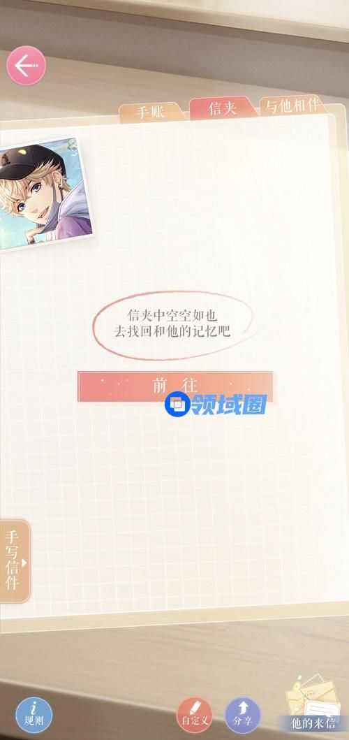1、点击专属纪念,进入手帐页面,选择信夹,在左下角分类里选择<手写信件>。