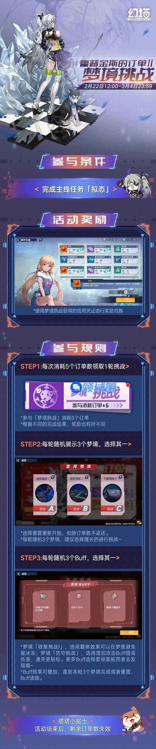 活动开启后,参与「梦境挑战」消耗5个订单,每次挑战都有3个不同的梦境可供选择,根据不同的完成结果,奖励也有所不同。塔塔小贴士:选好搭配,挑战不累,祝你好运,拓荒者~