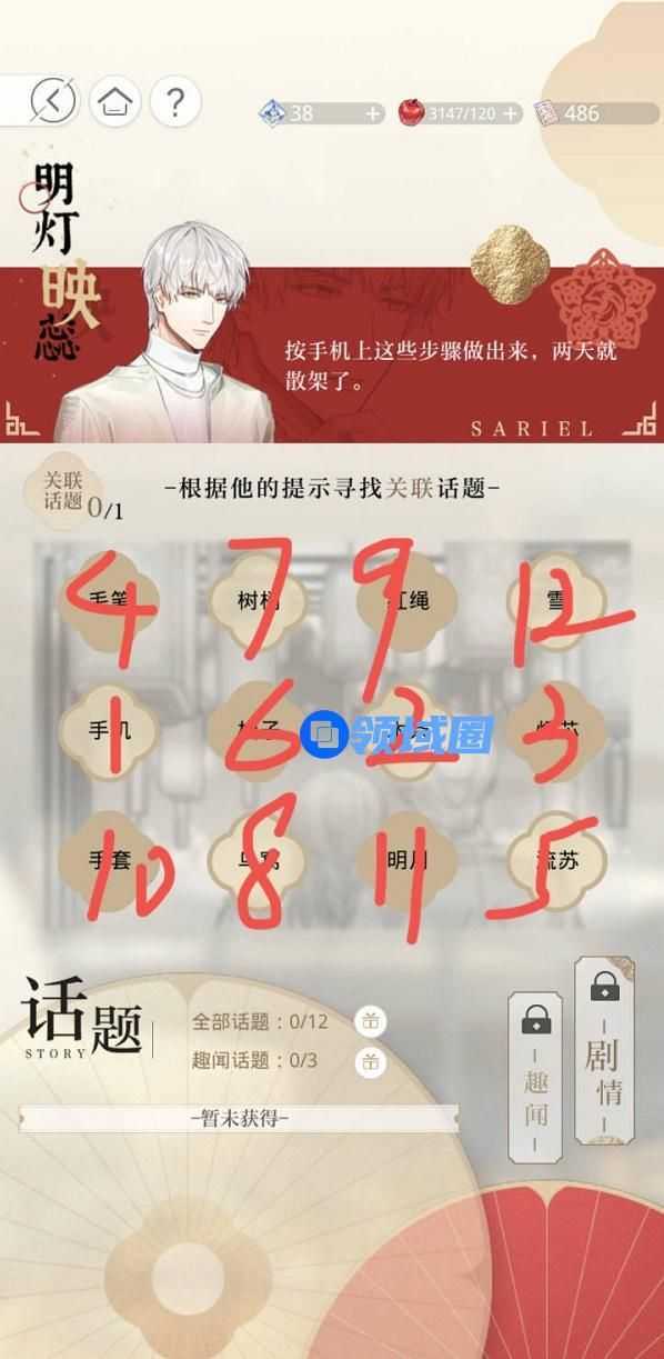 1、1手机,2木条,3灯芯,4毛笔,5流苏,6柚子,7树梢,8鸟窝,9红绳,10手套,11明月,12雪。