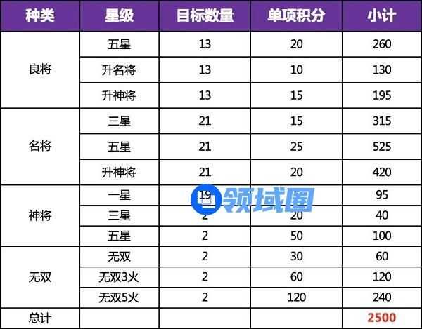2.其中13良将,21紫将需要全部升级为五星神将,而5火武将需要2只,另外1星神将(歪出来的)需要19只,总分刚好2500,但是抽卡毕竟是随机的,实际情况一定会和理论存在出入,这套方案看似2500分非常极限,但是实际操作过程中可以用一切方法进行弥补
