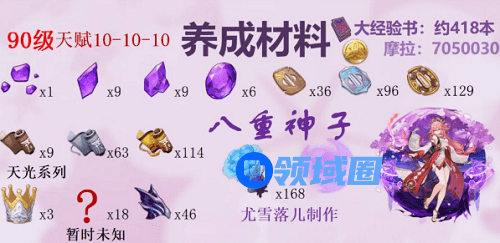 1、从原神官方发的图片我们可以推出八重神子拉满需要418本紫色升级书,7050030摩拉,46个深海龙蜥掉落的龙嗣伪鳍、168朵海灵芝、114本天光的哲129个名刀等材料。
