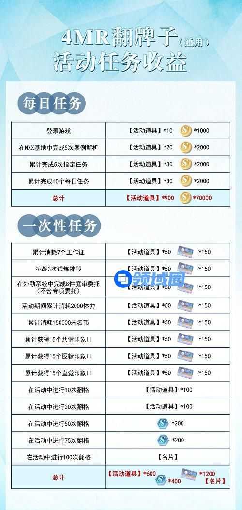 3、以上就是未定事件簿4MR翻牌活动的攻略了,以后的4MR活动差不多也是这个思路了,玩家们可以保存一下,以作下次类型活动的参考哦。