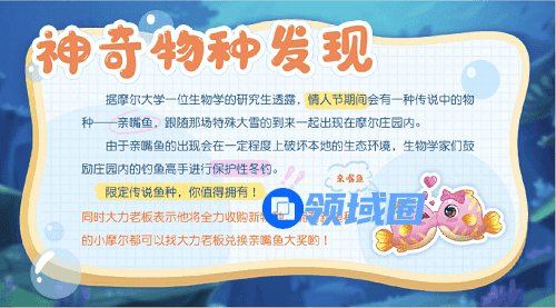4、亲嘴鱼是情人节限时推出的传说鱼类,所以只有在活动期间才会掉到这个鱼,而且晚上的时候是不会出现的,小摩尔们需要注意时间哦。