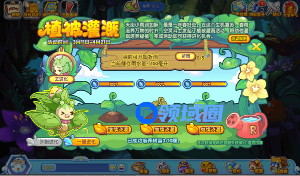 3、活动攻略:首先点击“祈雨”,与BOSS战斗,战斗胜利可获得500ml雨水,使用不同数量水灌溉得到的进度不同,每棵植物不同数量水灌溉得到的进度也都不同,但是目前以我的号来看,一直选择100ml的灌溉是最保值的,一天最多完成三棵植物的灌溉
