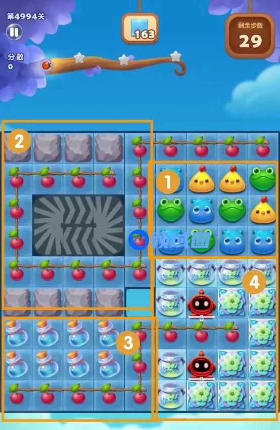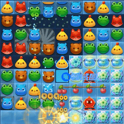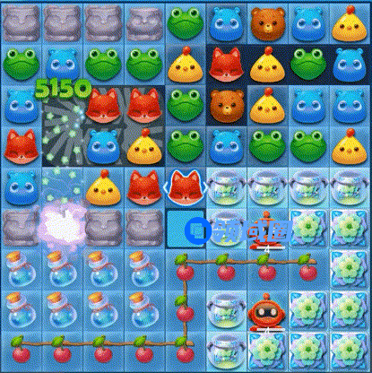 1、第一步,贴边三消击打,引爆樱桃炸弹,小动物掉落填充。