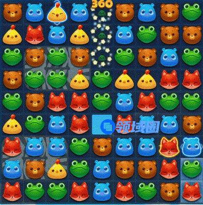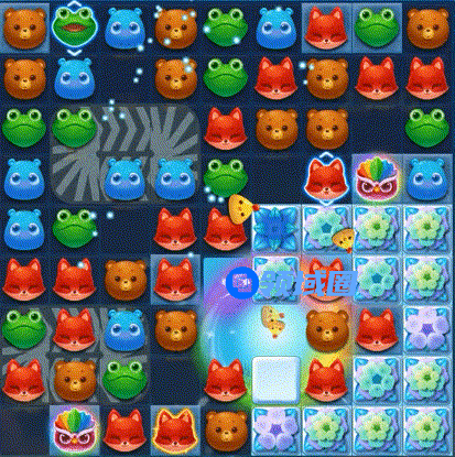 3、第三步:有贴边三消机会优先贴边清除雪块,同时消除红色动物可点亮染色宝宝然后交换染色宝宝,可出现大量直线、爆炸特效等进行辅助消除。