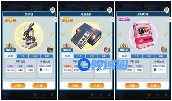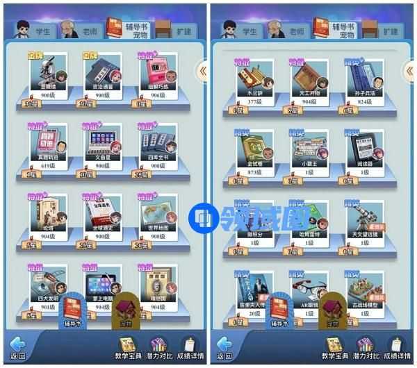 2、理科:种田活动需要5个学生,也就是10本书,1本显微镜,3本科目平均的书本,加起来就是4本书,剩下的6本书可以先升级4本优秀书本,也就是细解巧练、全优考典、预测卷、金试卷,优秀书本升级有个好处就是虽然少一个科目成绩加成,但是所需资源是精英书本的一半,所以培养起来比较快,如果资源比较少的同学也可以将第二和第三阶段混合进行或者调过来哈。升级完4本优秀书以后再建议升级居里夫人(化学科)和天文望远镜(物理课),化学科可以对应美食街活动,建议优先升级。如有余力可以考虑兑换天工开物等理科书本哈。