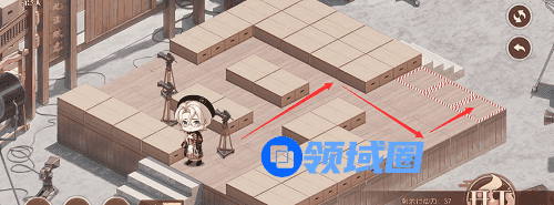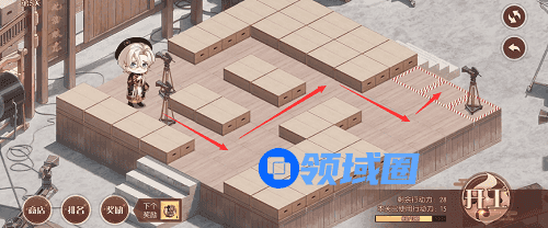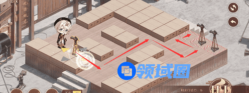 1、先推下面的摄像机,往前推两格,在去推上面红色路线的摄像机,推到下面,最后把第三个推到黑色的标记的位置就行了,形成下图的样子。
